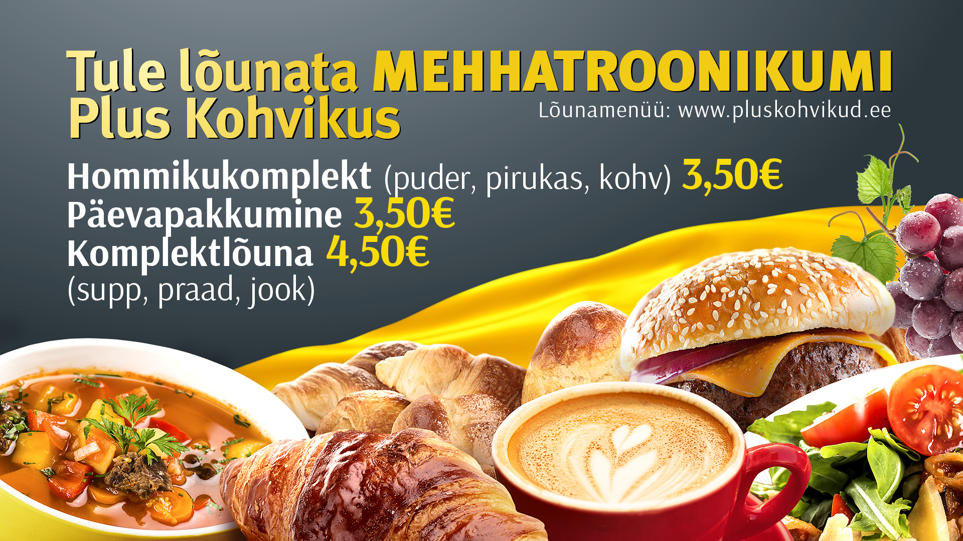 Plus Kohvik pakub igapäevaselt 5 erinevat praadi, taimetoitu ning 2 erinevat suppi. Saadaval soodne päevapakkumine (3,50€) ning komplektlõuna (4,50€). Kohvik on avatud 8.30 – 16.00. Alusta päeva kosutava hommikusöögiga. Lisaks värsked pirukad otse ahjust, maitsvad magustoidud, koogid ja smuutid.
