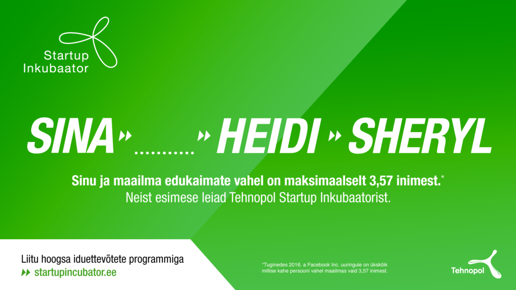 2016. aastal viis Facebook läbi uuringu, mille andmetel on mistahes kahe persooni vahel 3,57 inimest. Mõtle vaid – selleks, et esitleda oma ideed näiteks Sheryl Sandbergile või Richard Bransonile, vajad sa ainult kahte kontakti. Valides üheks neist kontaktidest Tehnopol Startup Inkubaatori, tekib sul ligipääs rahvusvahelisele mentor- ja investorvõrgustikule, mille kaudu maailma mõjukamateni jõudmine on vaid […]